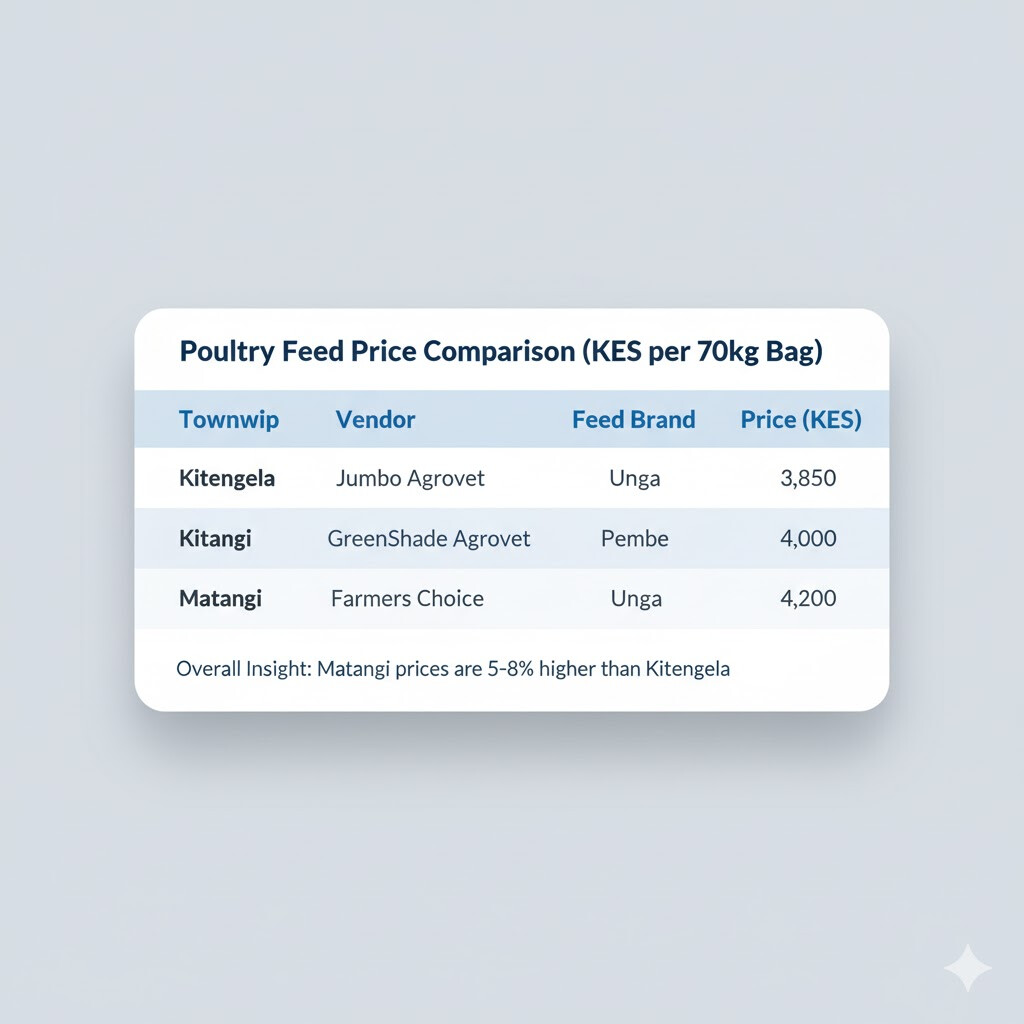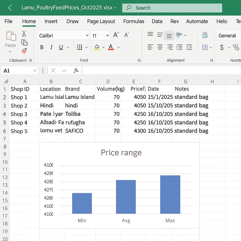 - Spreadsheet: “Lamu_PoultryFeedPrices_Oct2025.xlsx” summarizing the 6 entries, brand breakdown, and min/avg/max pricing.
