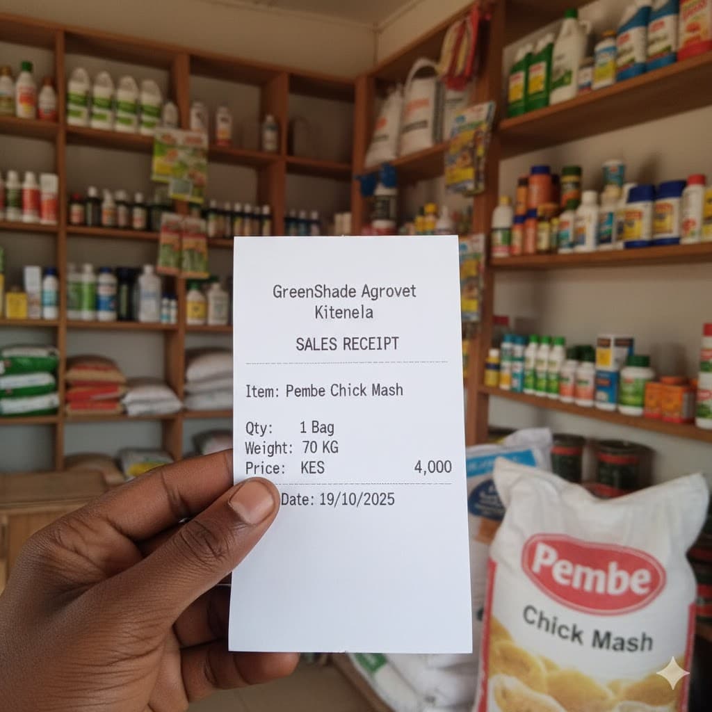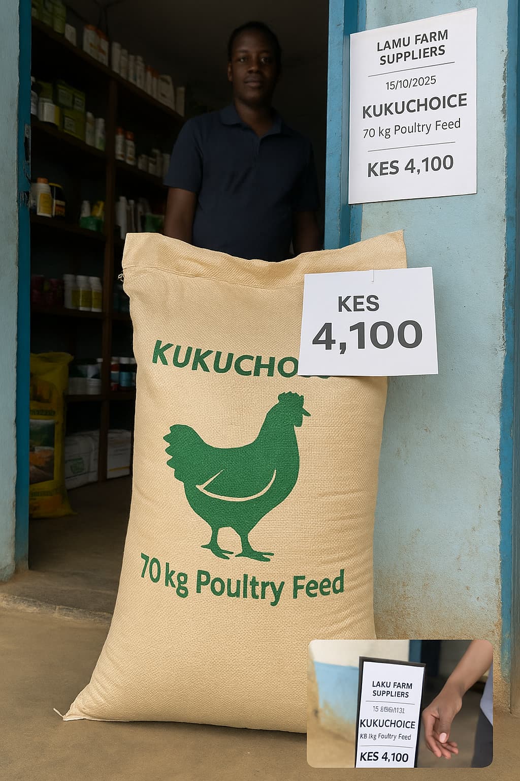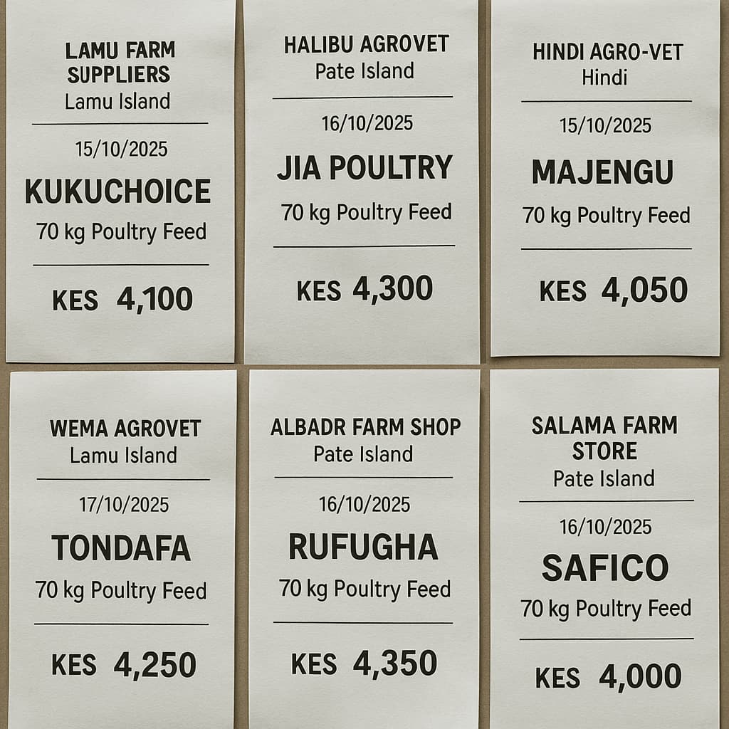 - Photo receipts from 6 agro‑vet shops in Lamu County (Lamu Island, Hindi, and Pate Island) showing 70 kg poultry feed bag pricing.