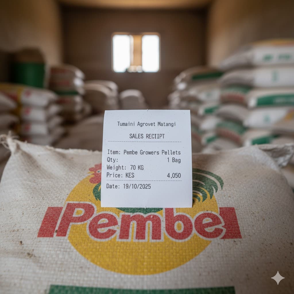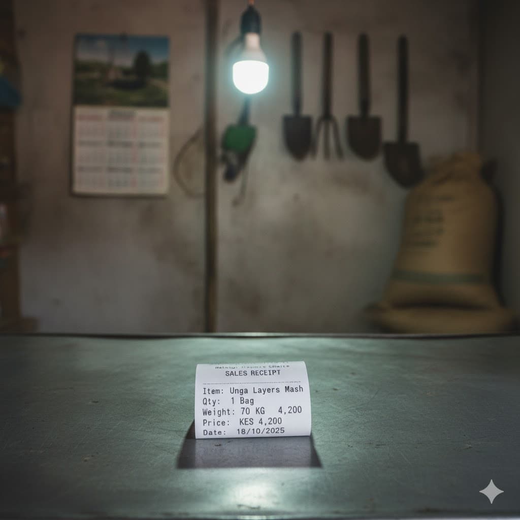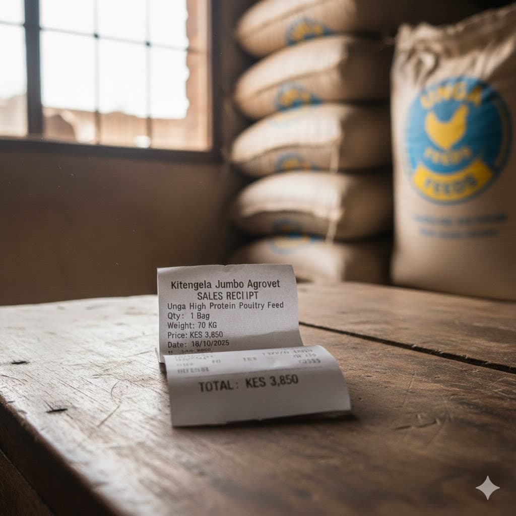 - Photo receipts from 6 agro‑vet shops in Lamu County (Lamu Island, Hindi, and Pate Island) showing 70 kg poultry feed bag pricing.